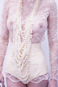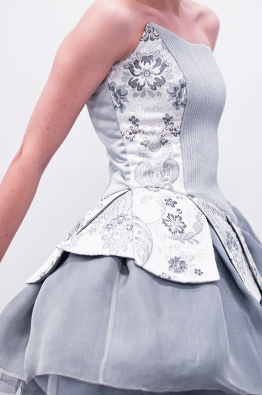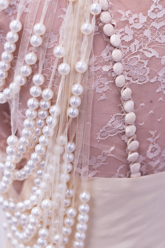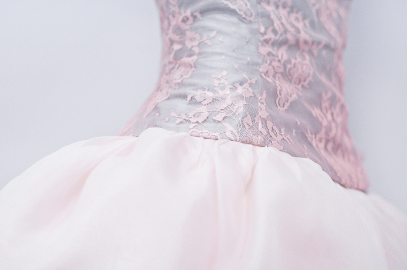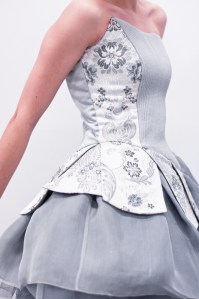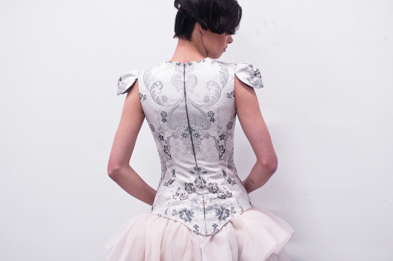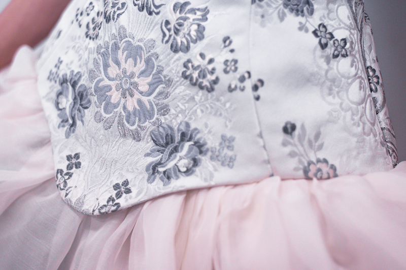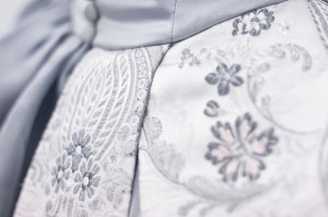 Subtelne detale: w postaci gęsto ułożonych guzików z koronki i jedwabiu, idealnie połączonego wzoru kwiatowego na gorsecie czy delikatne przeźroczystości i zwiewności jedwabnej organzy…